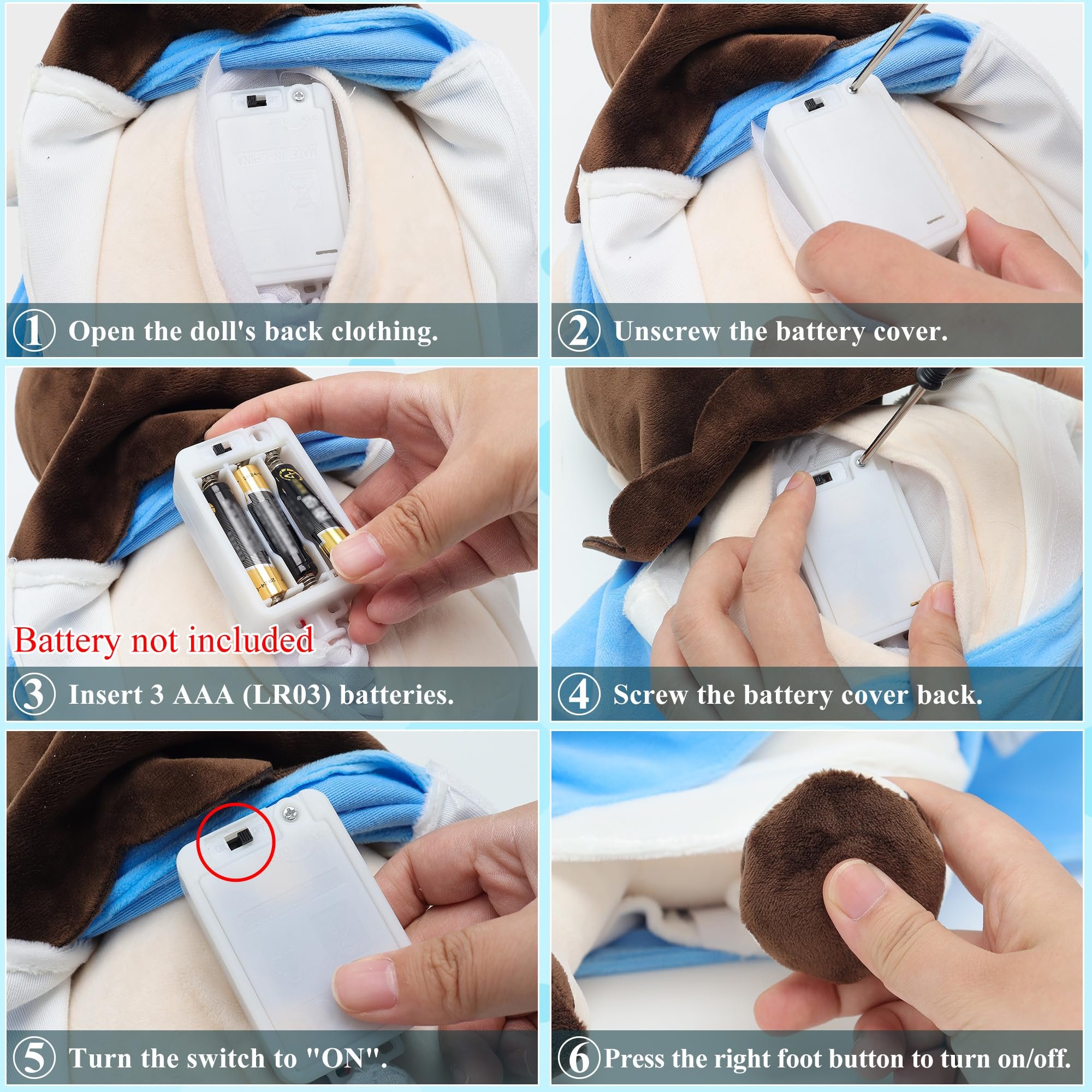 Easy Operation: Battery not included. First Open the clothes on the back of the doll to take out the battery compartment and unscrew the screws.Then install 3 new AAA batteries according to the rules(Please install the positive and negative terminals of the battery correctly);Keep the battery switch at the back in the state of “ON” (do not keep it in the “OFF” state);Press the the right foot (start button).Warm tips: please do not press hard on Jesus' tummy, do not drop and pull the doll. This will result in the doll not working properly